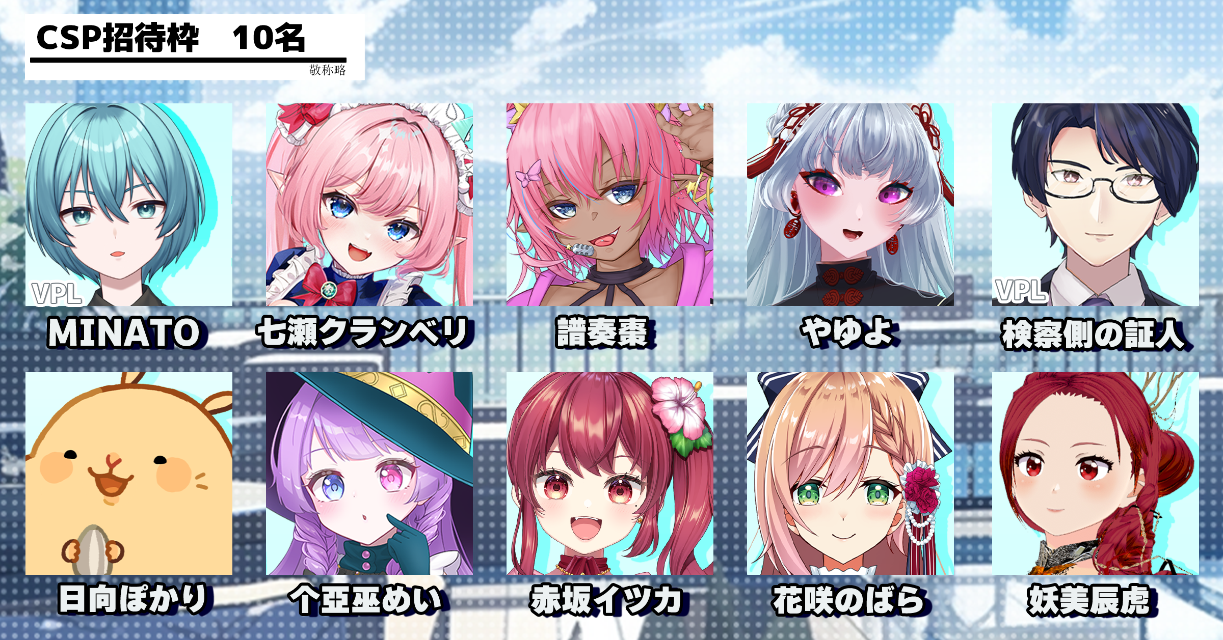 【CSP招待枠(10名)】七瀬クランベリ/日向ぽかり/个亞巫めい/譜奏棗/赤坂イツカ/妖美辰虎/MINATO/検察側の証人/やゆよ/花咲のばら