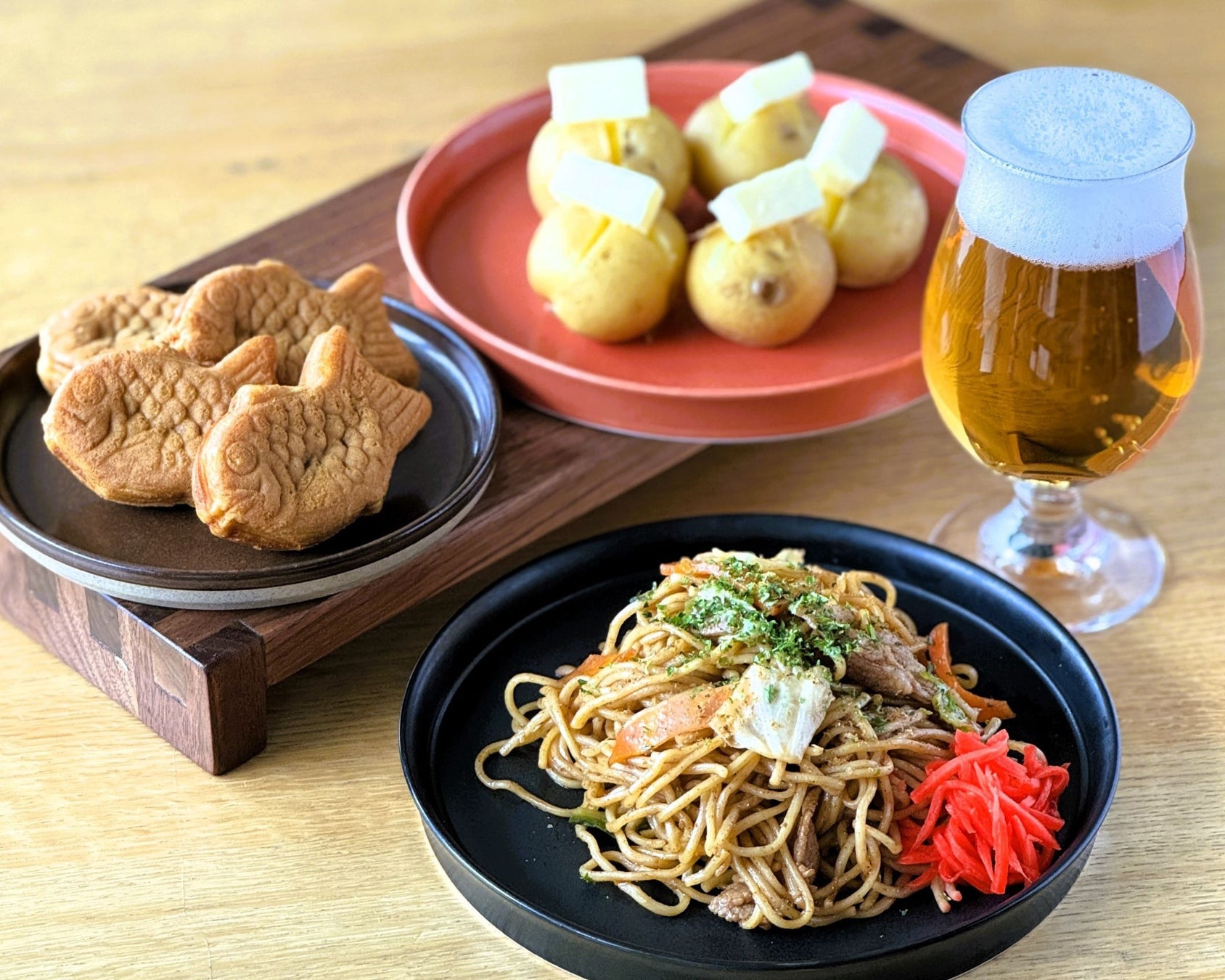 (上から順に)所沢産醤油を使った屋台の焼きそば、屋台のじゃがバター、あんこたっぷり たい焼き