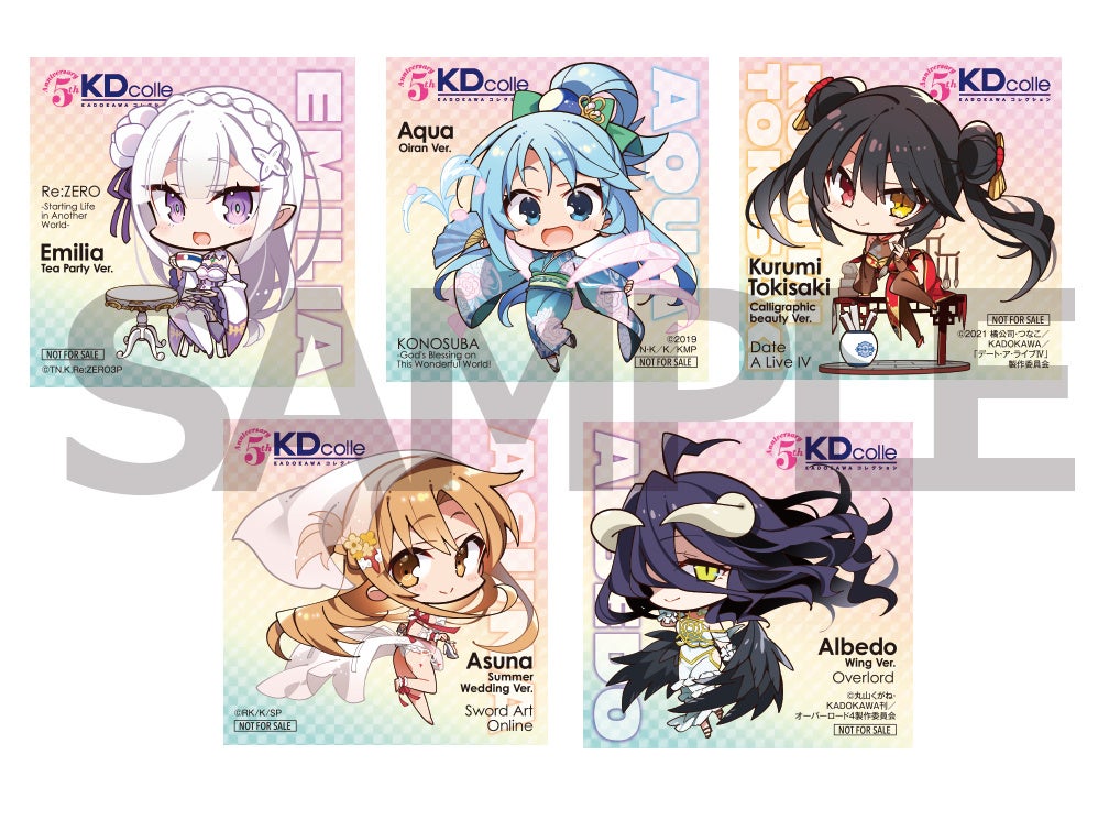 7/28(日)開催の「ワンダーフェスティバル2024[夏]」会場内の「KADOKAWA 電撃ホビーウェブ」ブースで、KDcolle5周年を記念したシールを配布いたします。過去に発売されたフィギュア5種をモチーフに、人気イラストレーター「こもわた遙華」先生がかわいいデフォルメイラストを描きおろし! このイラストを50mm×50mmのシールにして配布いたします。会場へお越しの際は、ぜひゲットしてください。