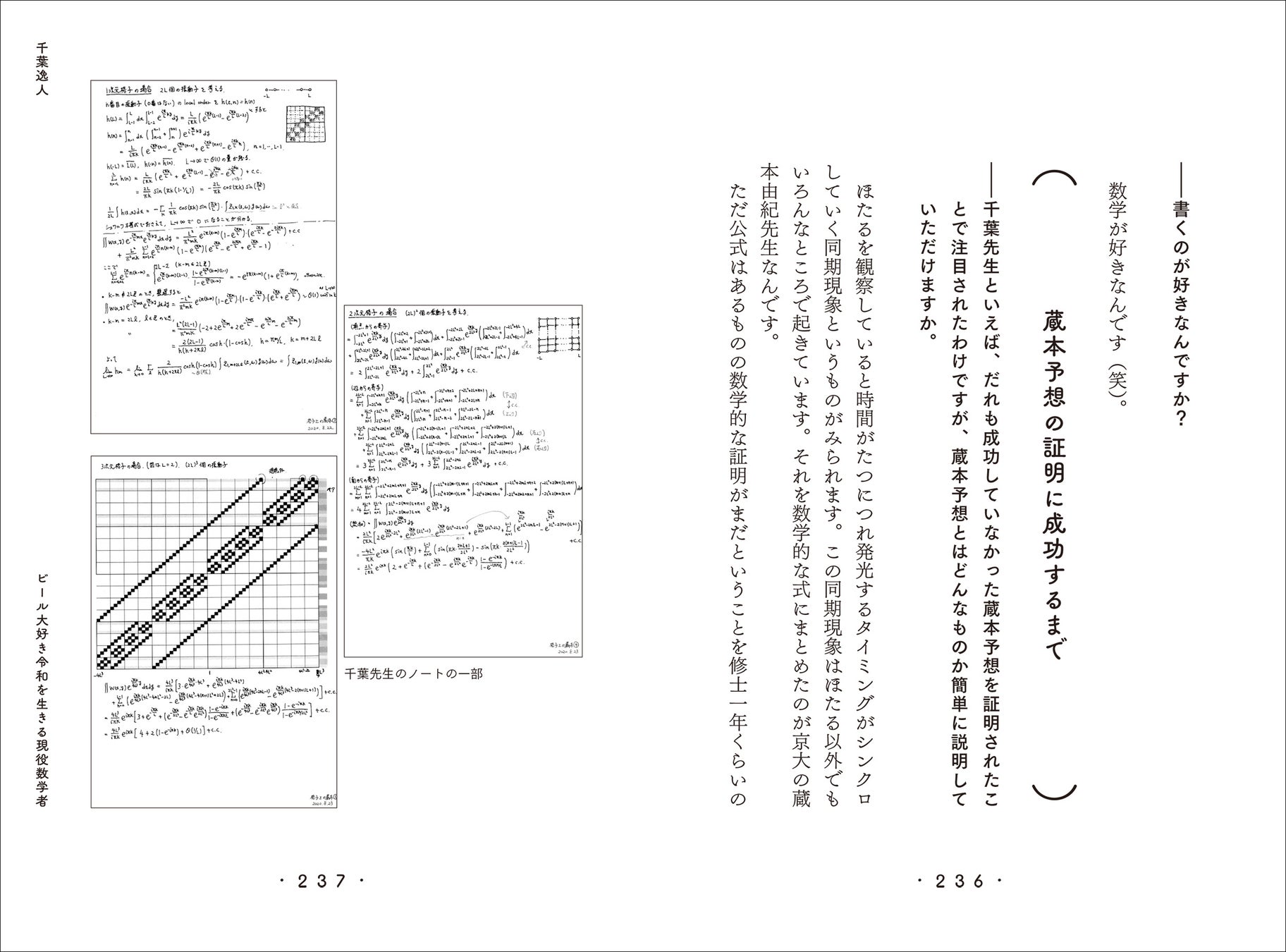 15人目の数学者として、令和を生きる現役数学者、本書の監修者でもある千葉逸人先生のインタビューを巻末に掲載。「数学者を志したきっかけは?」「数学者って普段はどんな研究をしているの?」「数学者を目指す若者へのアドバイス」などなど、普段はなかなか聞けないけど、気になるテーマをたくさん質問しました。千葉先生のノートの一部も写真で公開しています。