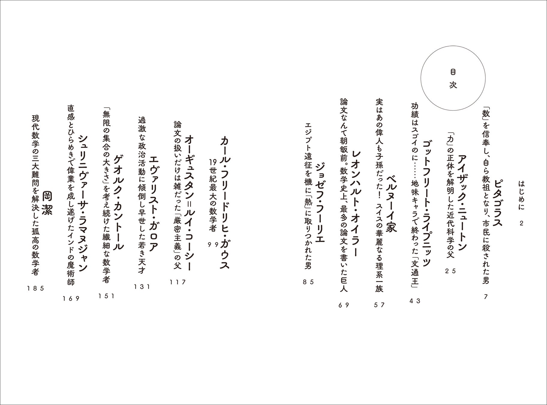 ピタゴラス、ニュートン、オイラー、ガウス、ガロア……。数学好きでなくても、誰もが一度は聞いたことのあるような偉人ばかり。それぞれの数学者たちの幼い頃からその生涯を終えるまでを、一人あたり15~20ページ分の文章でまとめてあるので読み応えたっぷりで楽しめます。