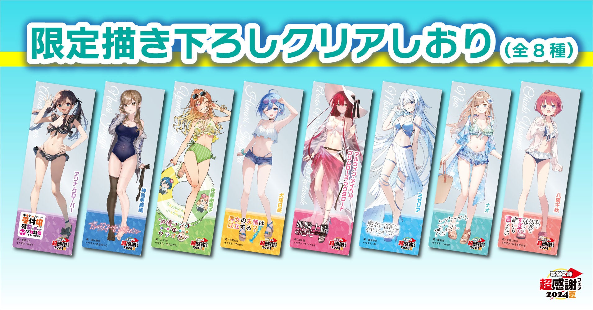 フェア参加書店にて対象書籍を購入すると、水着姿のヒロインが愛らしい【超感謝フェア2024夏 限定描き下ろしクリアしおり】をプレゼントします。