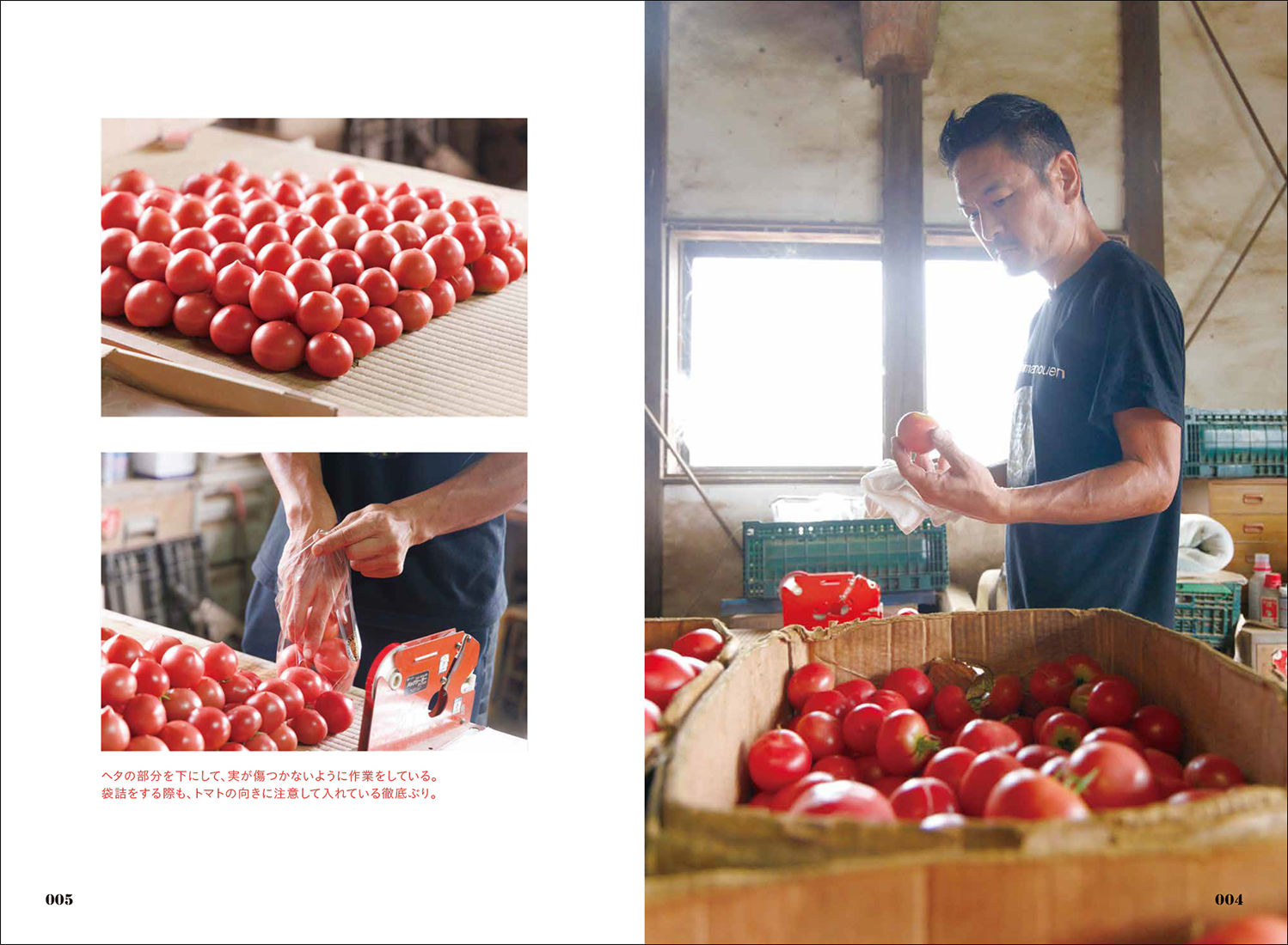 トマトの収穫から出荷するまでの過程も、写真をそえて詳しく収録しています。上記は、収穫したトマトを手作業で丁寧に拭いていき、袋に詰める工程のシーンです。