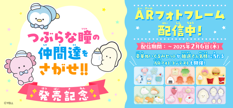 さらに、ARフォトフレームで写真を撮ってX(旧Twitter)に投稿していただいた方の中から、抽選で6名様に、「つぶらな瞳の仲間達」人気テーマの豪華ぬいぐるみセットいずれか1つが当たる、フォトコンテストを開催します。