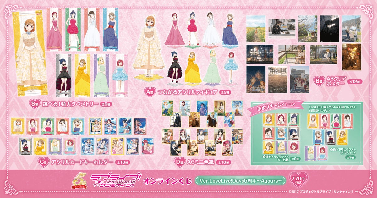 賞品は、「LoveLive!Days」で活躍中のイラストレーター・星夕先生による、Aqoursメンバーの新規描き下ろしドレスイラストなどを使用したオリジナルグッズとなります。