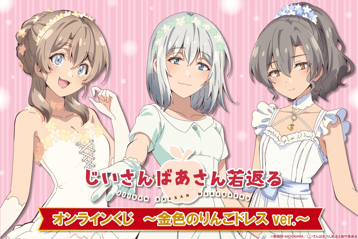 TVアニメ「じいさんばあさん若返る」くじ引き堂に登場! 素敵なドレスを着ているイネ、未乃、詩織の描き下ろしイラストを使用した豪華賞品が盛りだくさん!!