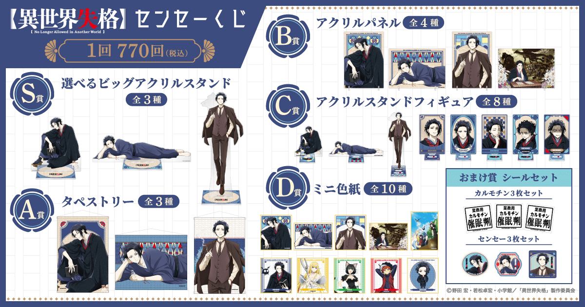 <異世界失格 センセーくじ 概要> 販売期間:2024年8月15日(木)12:00~2024年9月12日(木)11:59 販売価格:1回 770円(税込)※別途発送手数料が掛かります。 |
