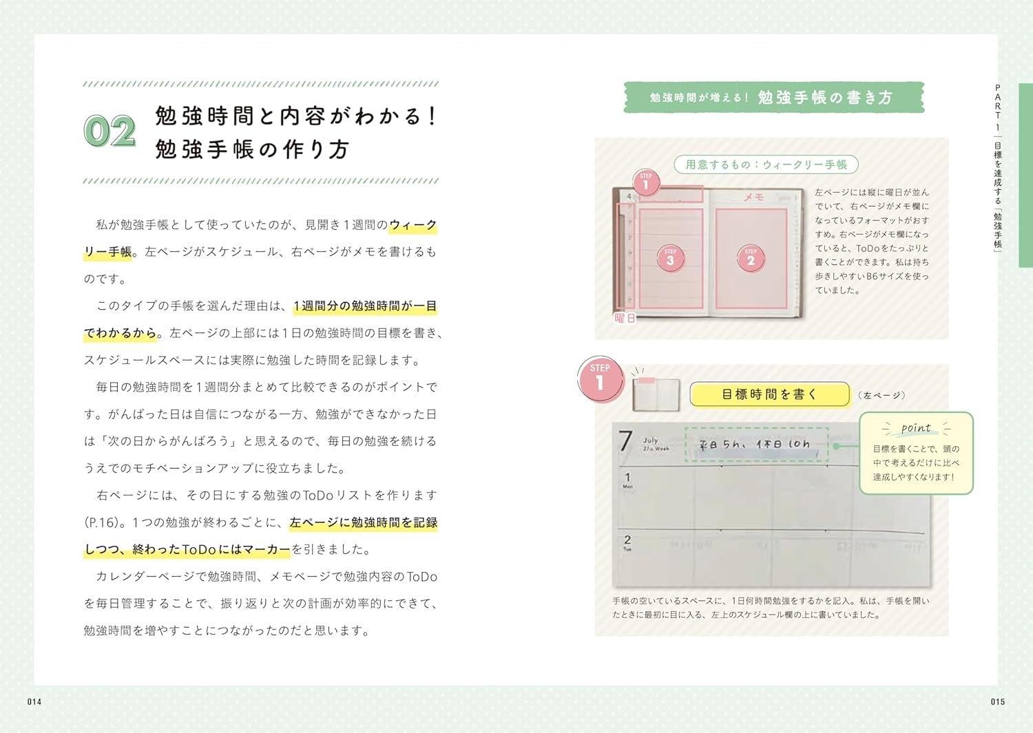 大学受験時、1年で偏差値を20も上げて志望校に合格した著者のいゆぴ。最大の秘訣は「勉強手帳」を作り、目標時間と勉強内容を書き込むことでした。勉強時間を見える化すると勉強時間を計画的に確保できるだけでなく、モチベーションアップにもつながります。本書では勉強手帳の作り方から続け方まで、写真たっぷりで細かく解説しています。