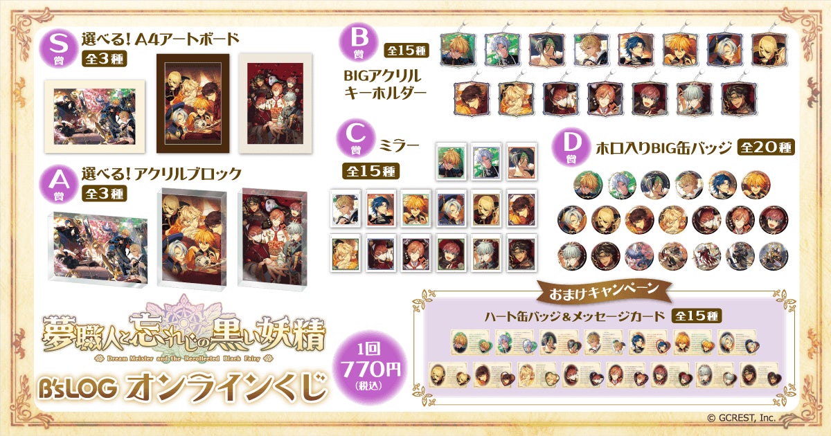 <夢職人と忘れじの黒い妖精 B's-LOGオンラインくじ 概要> 販売期間:2024年8月13日(火)12:00~2024年9月3日(火)11:59 販売価格:1回 770円(税込)※別途発送手数料が掛かります。 |