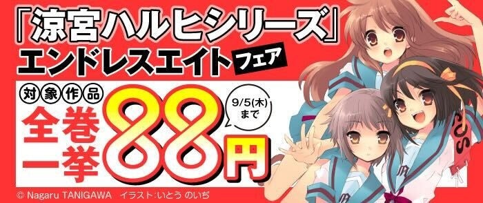 「涼宮ハルヒ」シリーズの対象商品電子書籍が、エンドレスエイトにちなみ、一挙88円!