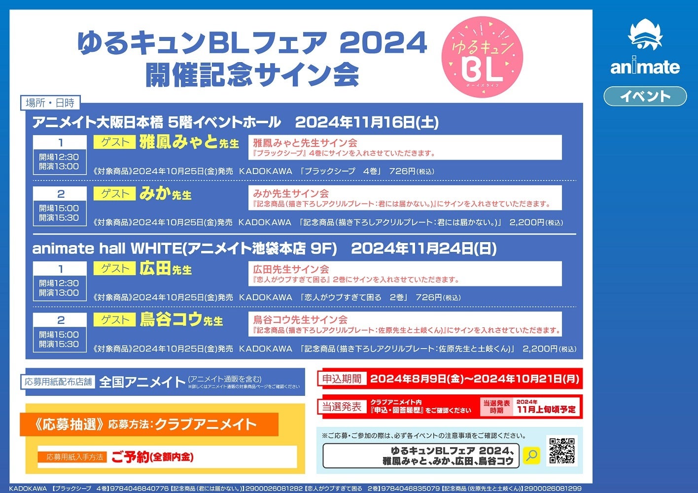 『君には届かない。』みか先生、『恋人がウブすぎて困る』広田先生、『佐原先生と土岐くん』鳥谷コウ先生、『ブラックシープ』雅鳳みゃと先生によるサイン会を実施いたします。