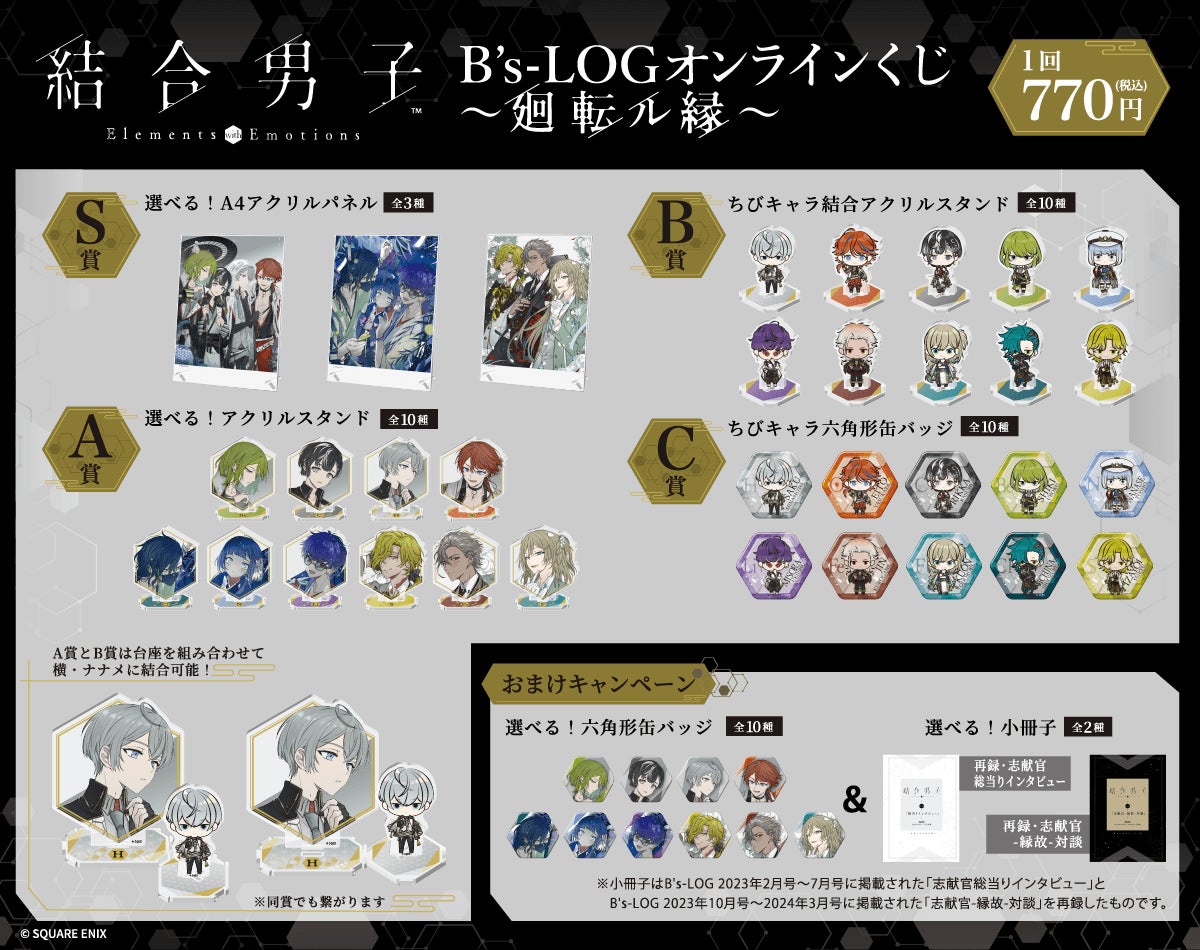 <『結合男子』B's-LOGオンラインくじ ~廻転ル縁~ 概要> 販売期間:2024年8月27日(火)12:00~2024年9月17日(火)11:59 販売価格:1回 770円(税込)※別途発送手数料が掛かります。 |