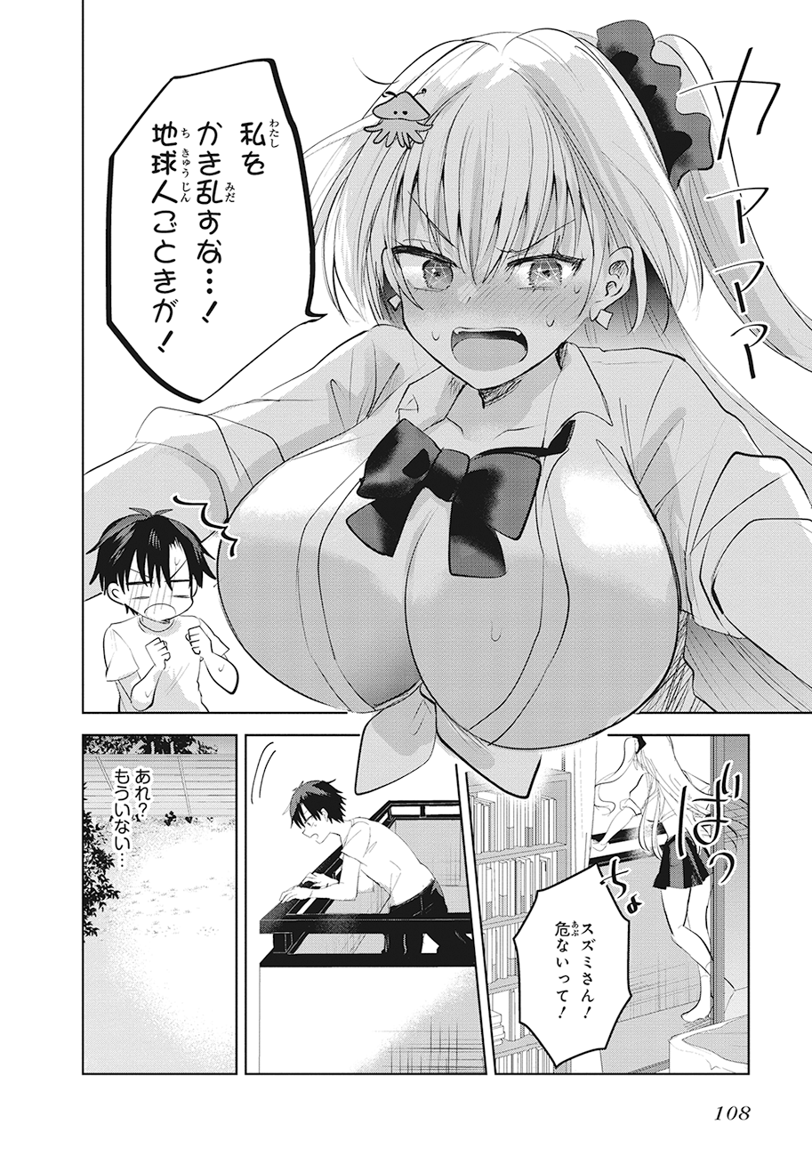 第2巻では、ハイネさんの同僚であるスズミが彼女を母船へ連れ戻すべく地球を訪れます。抵抗の意志が固いハイネさんを見て、スズミは正体を隠して宗太を観察することになったのですが……。新たな来訪者に困惑する宗太と、ぐいぐい迫るスズミ――二人のハラハラドキドキの掛け合いにもぜひ注目してみてください。