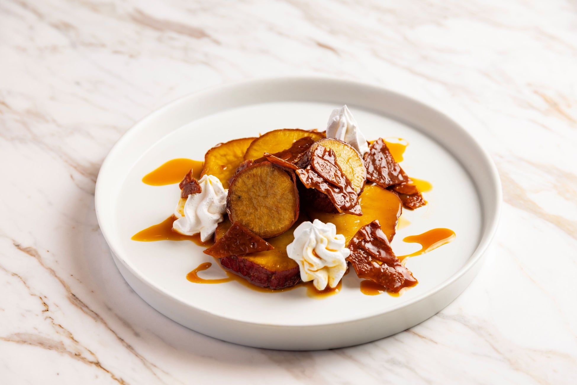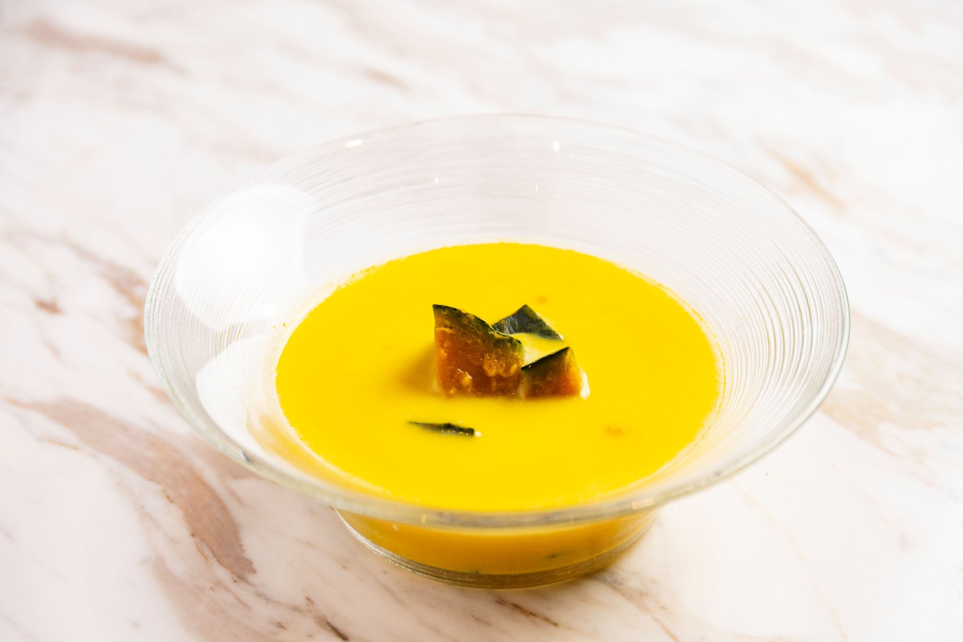 左上から右上の順に)サツマイモと根菜の照り焼きソース、栗カボチャの冷製スープ 豆乳仕立て、