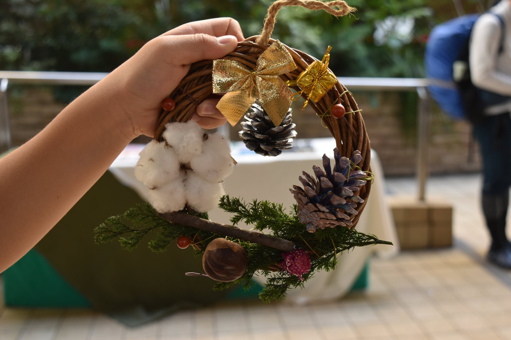 クズなどのツルを使った直径15㎝ほどのミニリース作り。ツルを集めて形を整え、草木や木の実、リボンなどで飾り、リースを作る。会場内で随時受付。