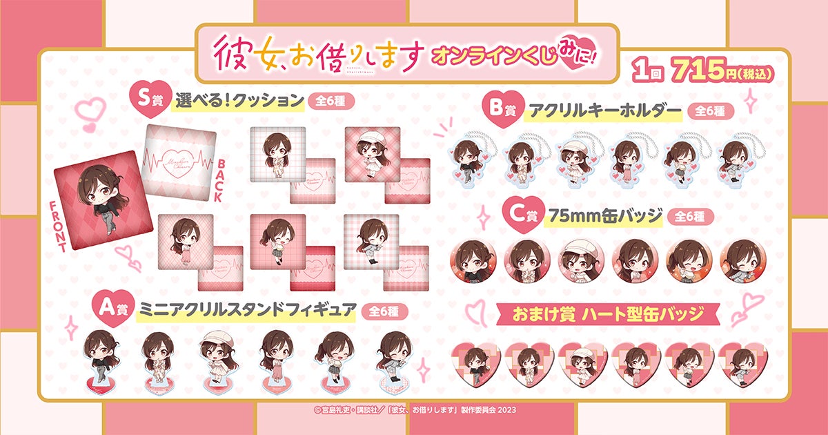 <「彼女、お借りします」オンラインくじ みに! 概要> 販売期間:2024年9月10日(火)12:00~2024年10月8日(火)11:59 販売価格:1回 715円(税込)※別途発送手数料が掛かります。 |