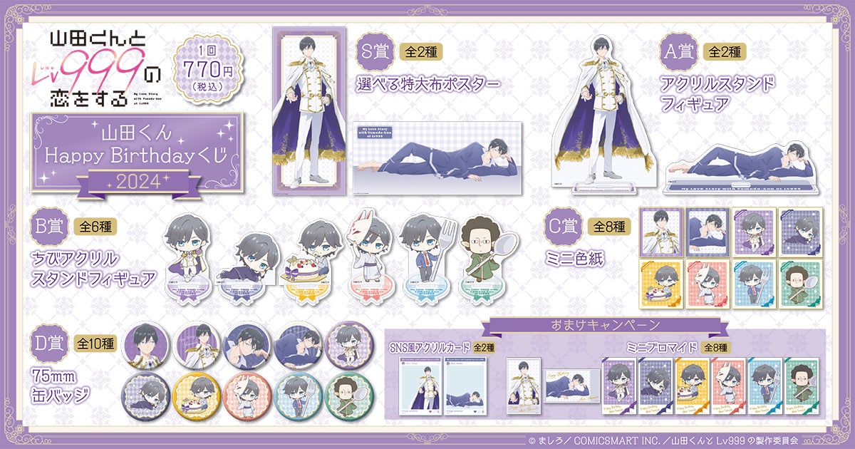 <「山田くんとLv999の恋をする」山田くんHappyBirthdayくじ2024 概要> 販売期間:2024年9月12日(木)12:00~2024年10月3日(木)11:59 販売価格:1回 770円(税込)※別途発送手数料が掛かります。 |