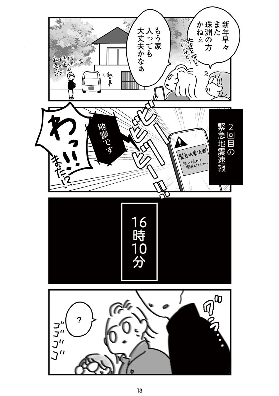 大津波警報が出され、家族で避難を試みるも、道路は亀裂だらけ。なんとか家に戻れたものの、水道は使えず、頻発する余震に備えて車中泊を余儀なくされる過酷な日々が始まった。