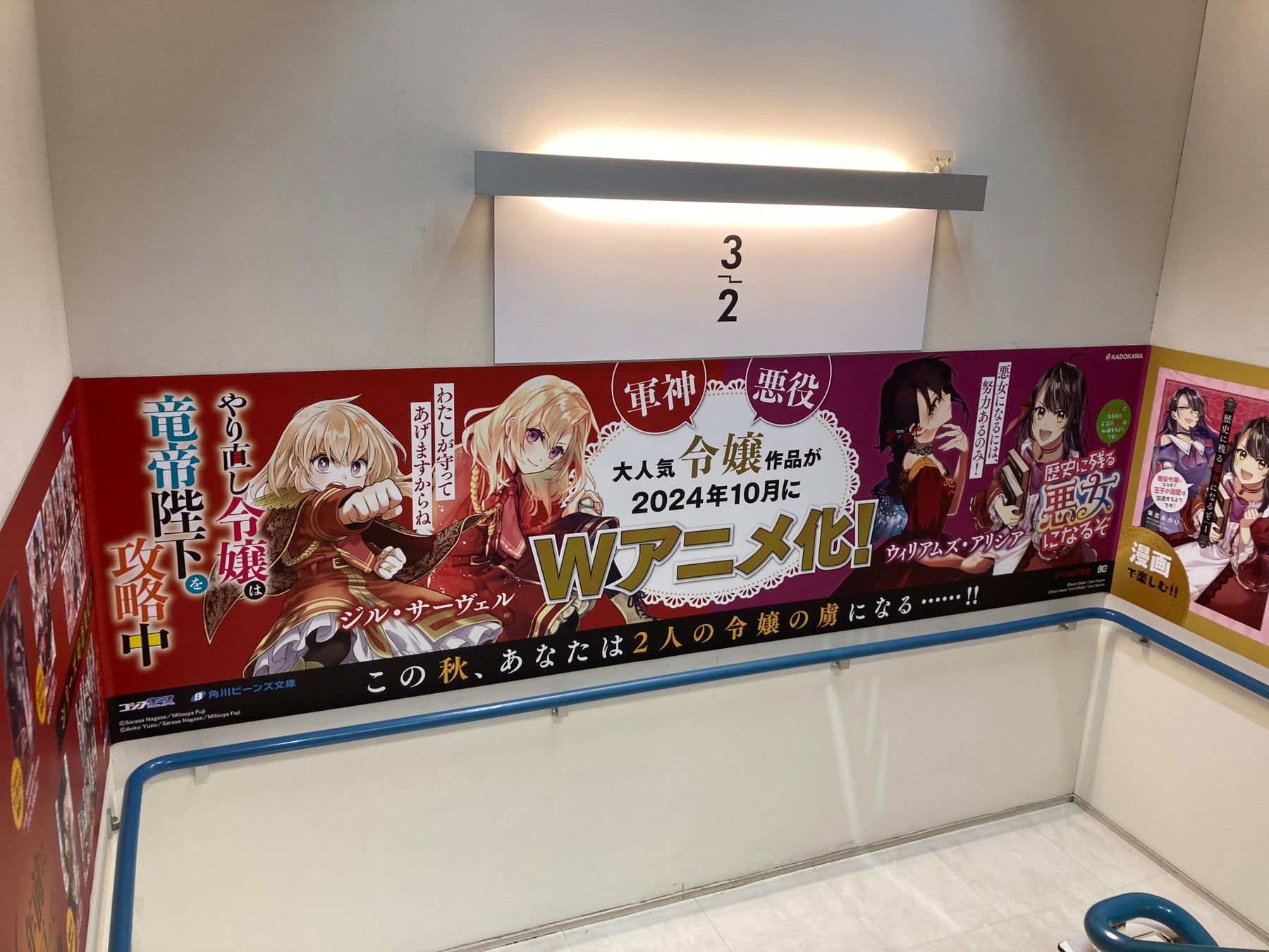KADOKAWAの大人気令嬢作品『やり直し令嬢は竜帝陛下を攻略中』(角川ビーンズ文庫刊)と『歴史に残る悪女になるぞ』(ビーズログ文庫刊)のWアニメ化を記念して、アニメイト池袋本店に2作品の合同広告を掲出いたします。