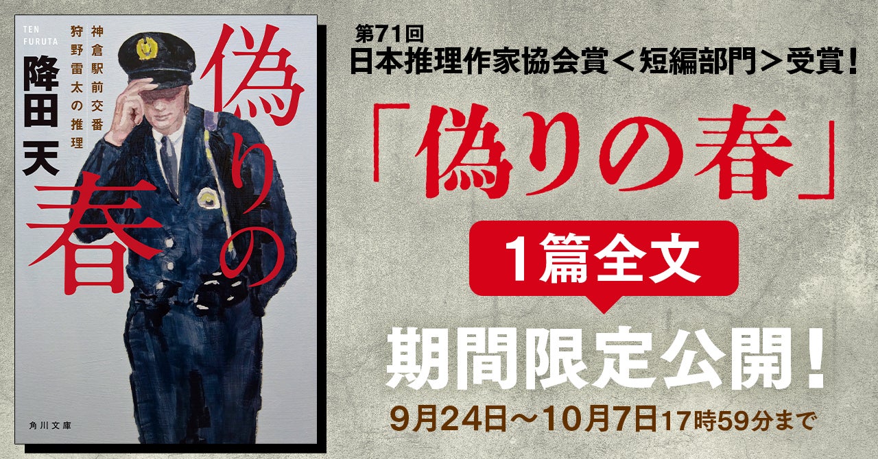 『朝と夕の犯罪 神倉駅前交番 狩野雷太の推理』発売を記念し、日本推理作家協会賞<短編部門>を受賞した『偽りの春 神倉駅前交番 狩野雷太の推理』を、2024年9月24日(火)12時~2024年10月7日(月)17時59分まで、カドブンnoteで全文公開中です!