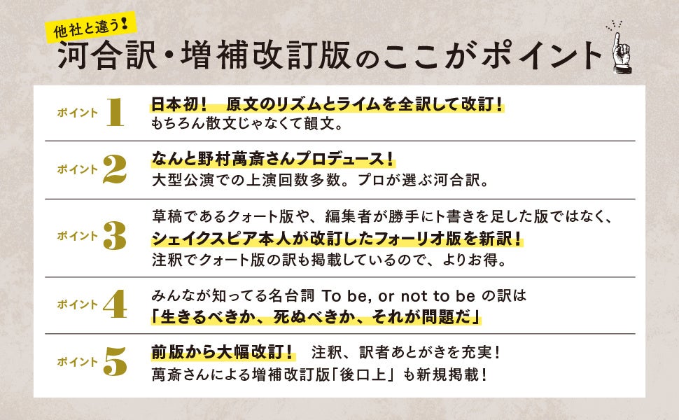 英国人と同じように味わえる、シェイクスピア最新訳の決定版!」(野村萬斎)