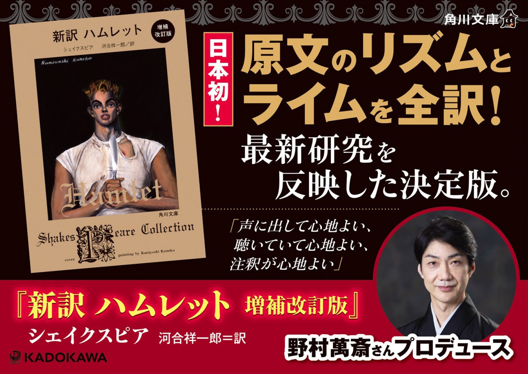 株式会社KADOKAWA(本社:東京都千代田区、 代表取締役社長:夏野剛)は、 2024年9月24日(火)に、『新訳 ハムレット 増補改訂版』(シェイクスピア 河合祥一郎=訳 角川文庫)を発売します。
