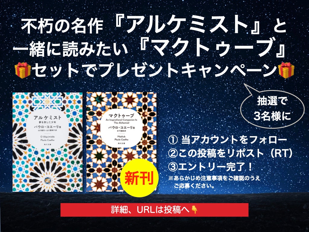 株式会社KADOKAWAは2024年9月20日(金)、パウロ・コエーリョ『マクトゥーブ』(木下眞穂訳)の発売を記念して、抽選で3名様に『アルケミスト』と『マクトゥーブ』がセットで当たるプレゼントキャンペーンを実施します。