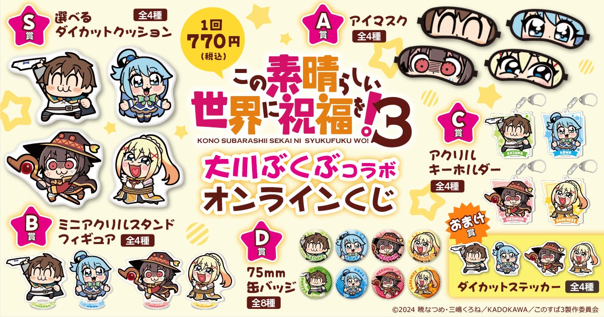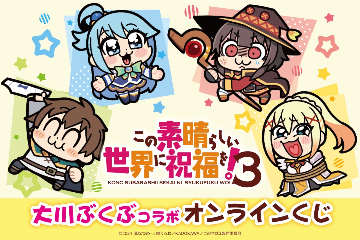 <TVアニメ「この素晴らしい世界に祝福を!3」大川ぶくぶコラボ オンラインくじ 概要> 販売期間:2024年10月10日(木)17:00~2024年10月31日(木)16:59 販売価格:1回 770円(税込)※別途発送手数料が掛かります。 |
