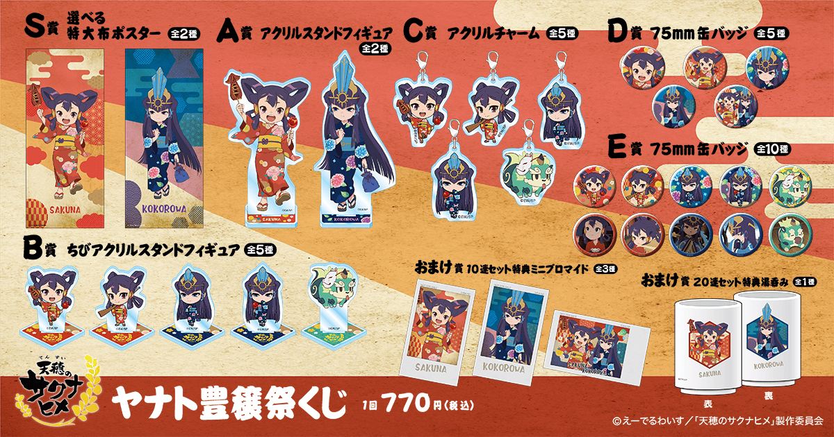 <TVアニメ「天穂のサクナヒメ」ヤナト豊穣祭くじ 概要> 販売期間:2024年10月15日(火)12:00~2024年11月12日(火)11:59 販売価格:1回 770円(税込)※別途発送手数料が掛かります。 |