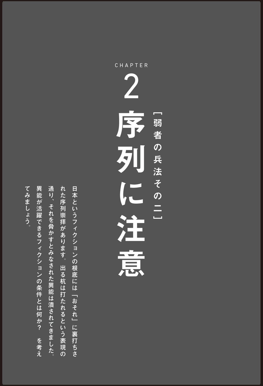 日本というフィクションの根底には「おそれ」に裏打ちされた序列崇拝があります。出る杭は打たれるという表現の通り、それを脅かすとみなされた異能は潰されてきました。異能が活躍できるフィクションの条件とは何か? を考えてみましょう。
