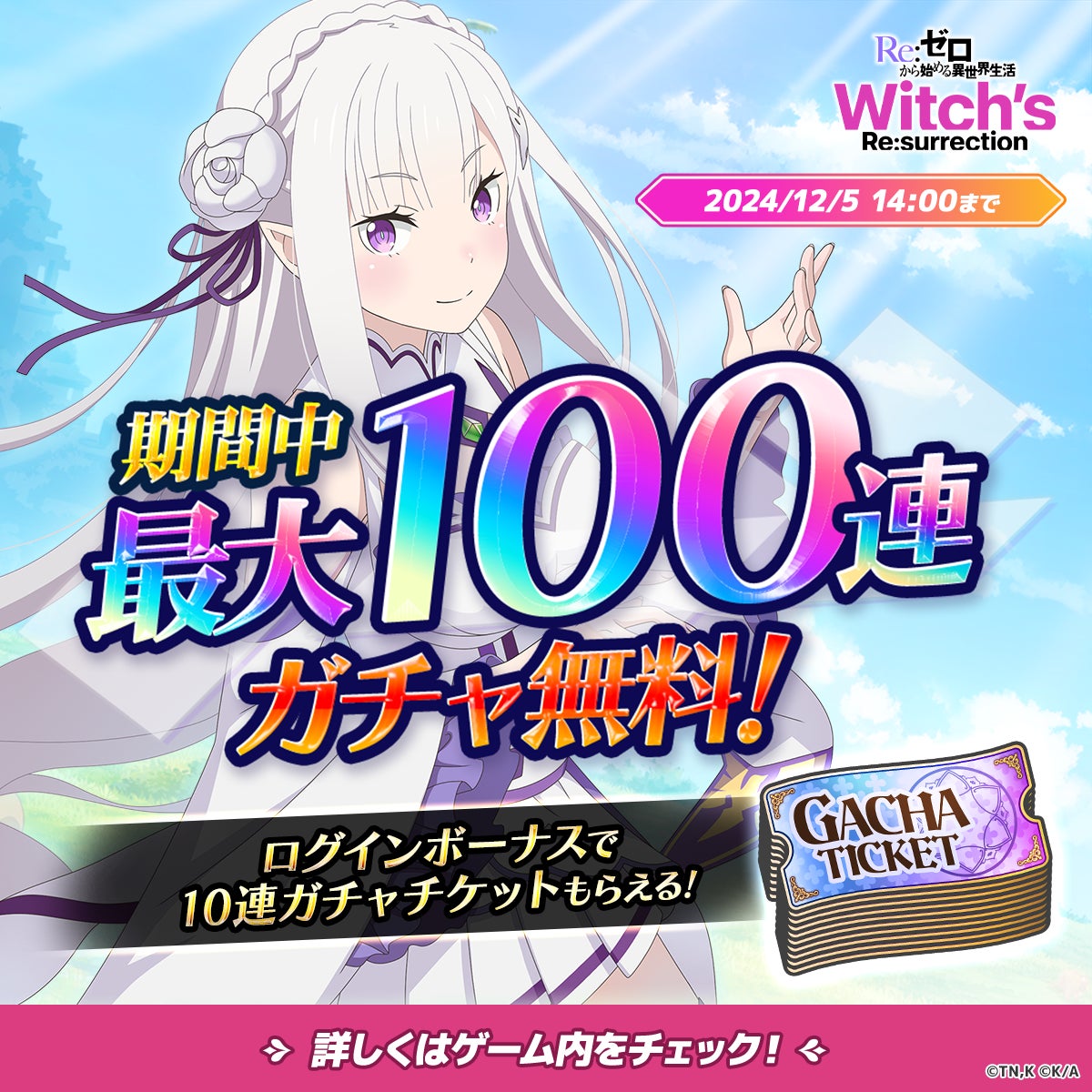CM放送記念! 『Re:ゼロから始める異世界生活 Witch’s Re:surrection』にて、毎日ログインで最大100連無料ガチャが引けるキャンペーンを開始!