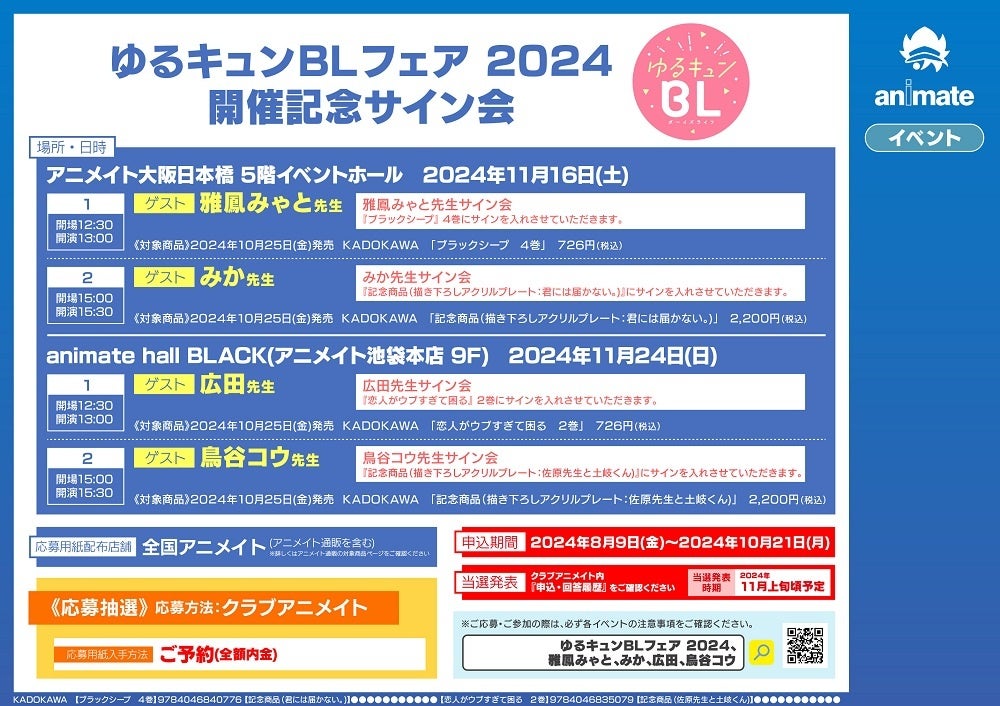 『君には届かない。』みか先生、『恋人がウブすぎて困る』広田先生、『佐原先生と土岐くん』鳥谷コウ先生、『ブラックシープ』雅鳳みゃと先生によるサイン会を実施いたします。