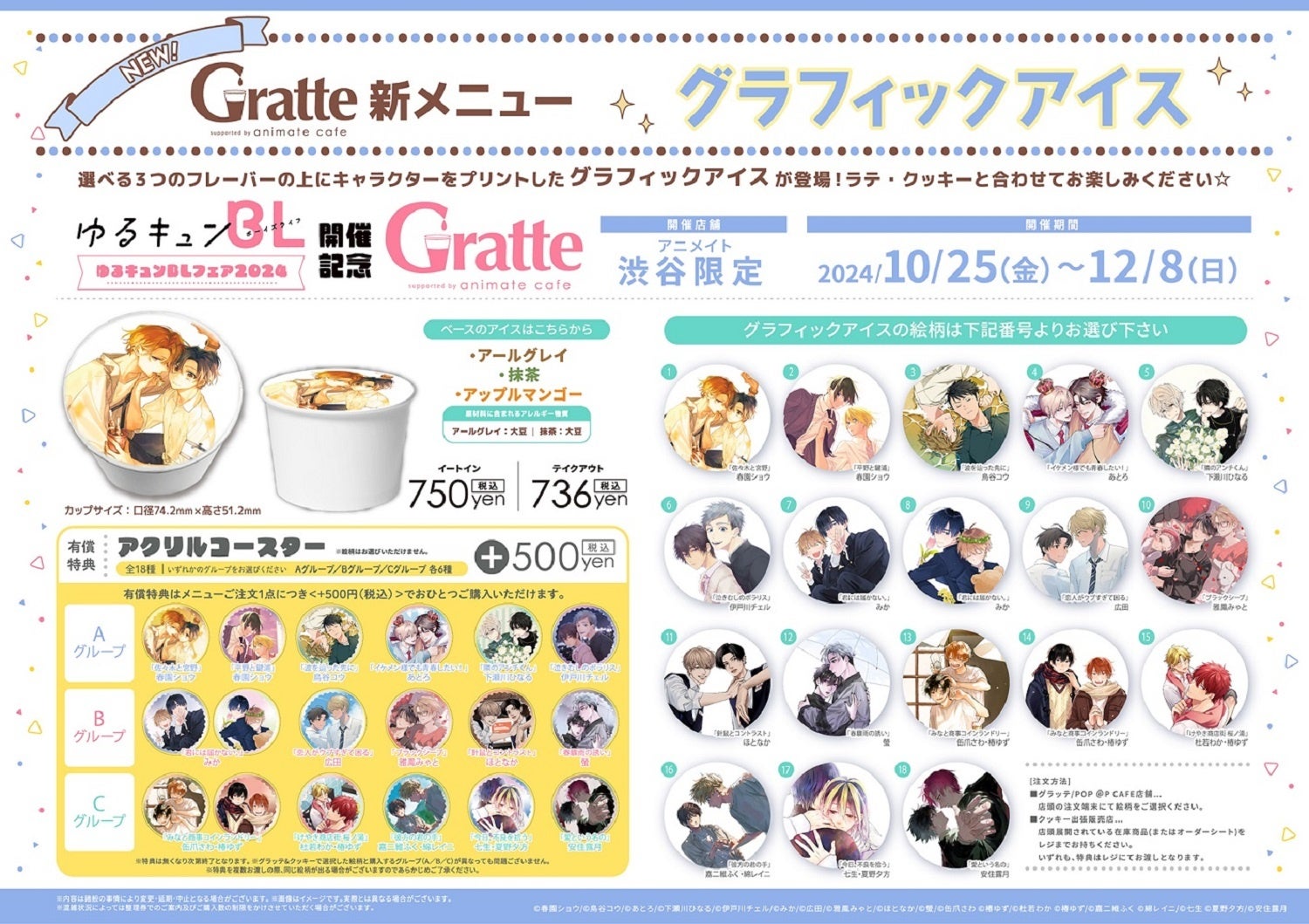 10月25日から12月8日まで、アニメイトの対象店舗にてグラッテ、アイシングクッキー、および新商品のグラフィックアイスを発売! 限定アクリルコースターの販売も行います♪