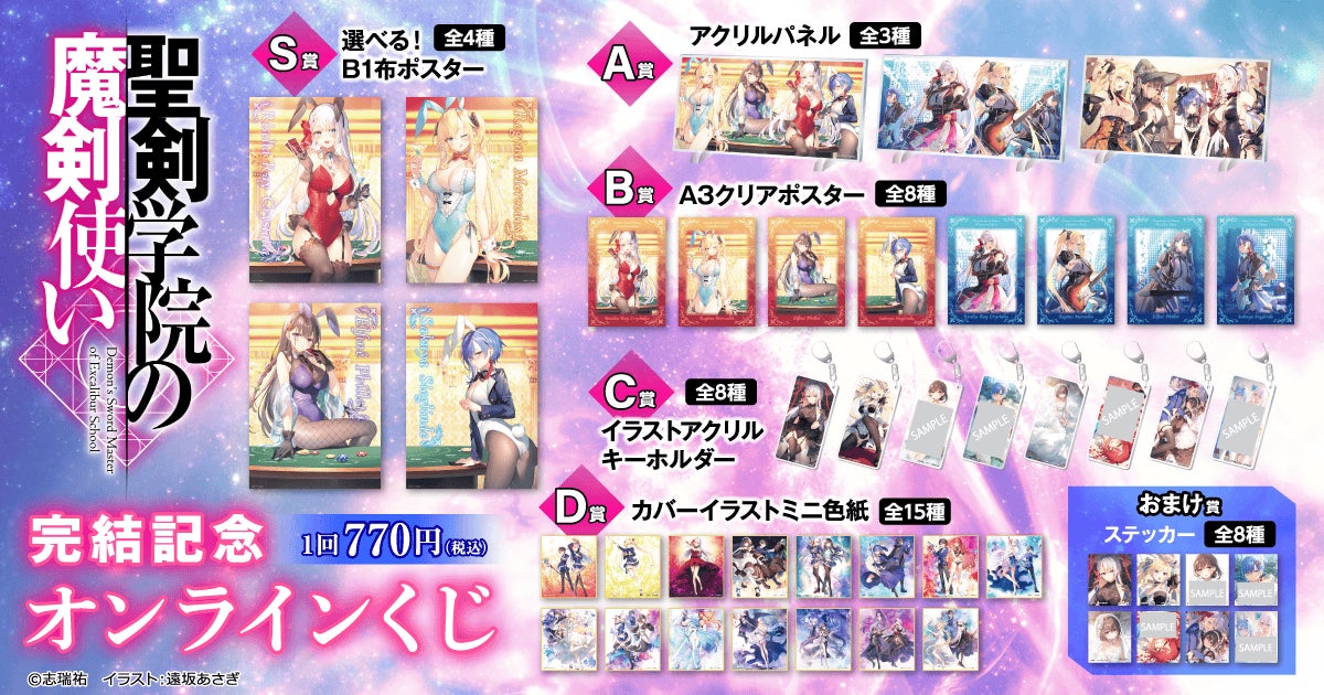 <聖剣学院の魔剣使い 完結記念オンラインくじ 概要> 販売期間:2024年10月25日(金)12:00~2024年11月21日(木)11:59 販売価格:1回 770円(税込)※別途発送手数料が掛かります。 |