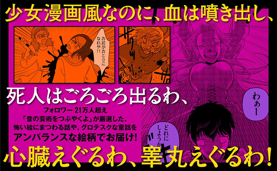 今回は「昔の芸術をつぶやくよ」の厳選した12本の話を、個性的な5人の漫画家がコミカライズ。少女漫画風、ギャルマンガ風、コミックエッセイ風と……内容は恐ろしくてグロテスクなのに絵柄が可愛くてどこかアンバランスで不気味な漫画にしてくれました。読みながら感情がぐちゃぐちゃになること間違いなしです。