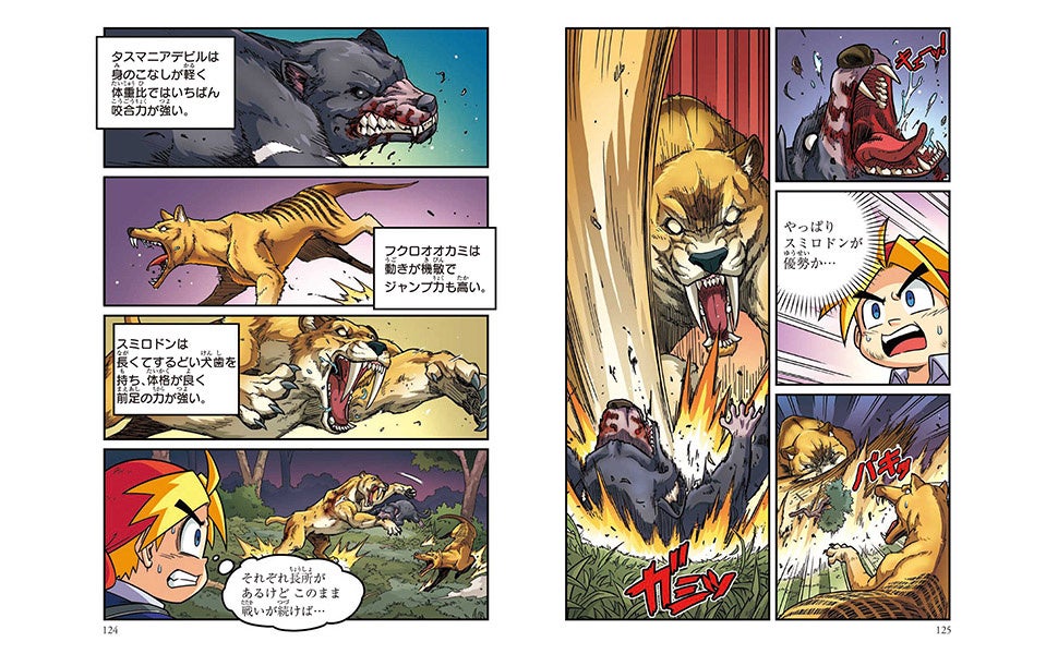 「悪魔」の名前を持つタスマニアデビル。実は小さいながらもかむ力は一番強く、するどい牙と圧倒的なパワーを持つスミロドン(サーベルタイガー)にも臆することなく正面からぶつかっていきます。さらに、フクロオオカミも驚きのバトル方法で立ち向かうなど、見どころ満載!