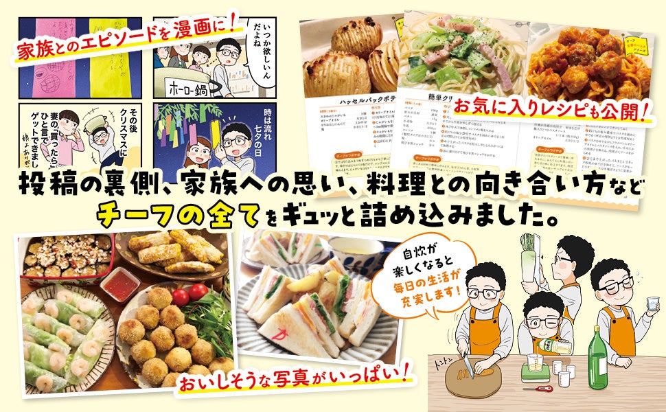著者・チーフ:平日は単身赴任でひとり暮らし、週末は家族のもとへ帰って料理を担当。平日のひとり飯や週末の家族飯、スイーツやパンなど作った料理の写真をXやInstagramで発信している。料理のことだけではなく、娘や息子、奥さんの話や家庭菜園、キッチンや調理器具へのこだわりなど、人柄を覗き見ることができる投稿も多く、料理を楽しむ姿勢や家族との向き合い方を支持するファンが多い。