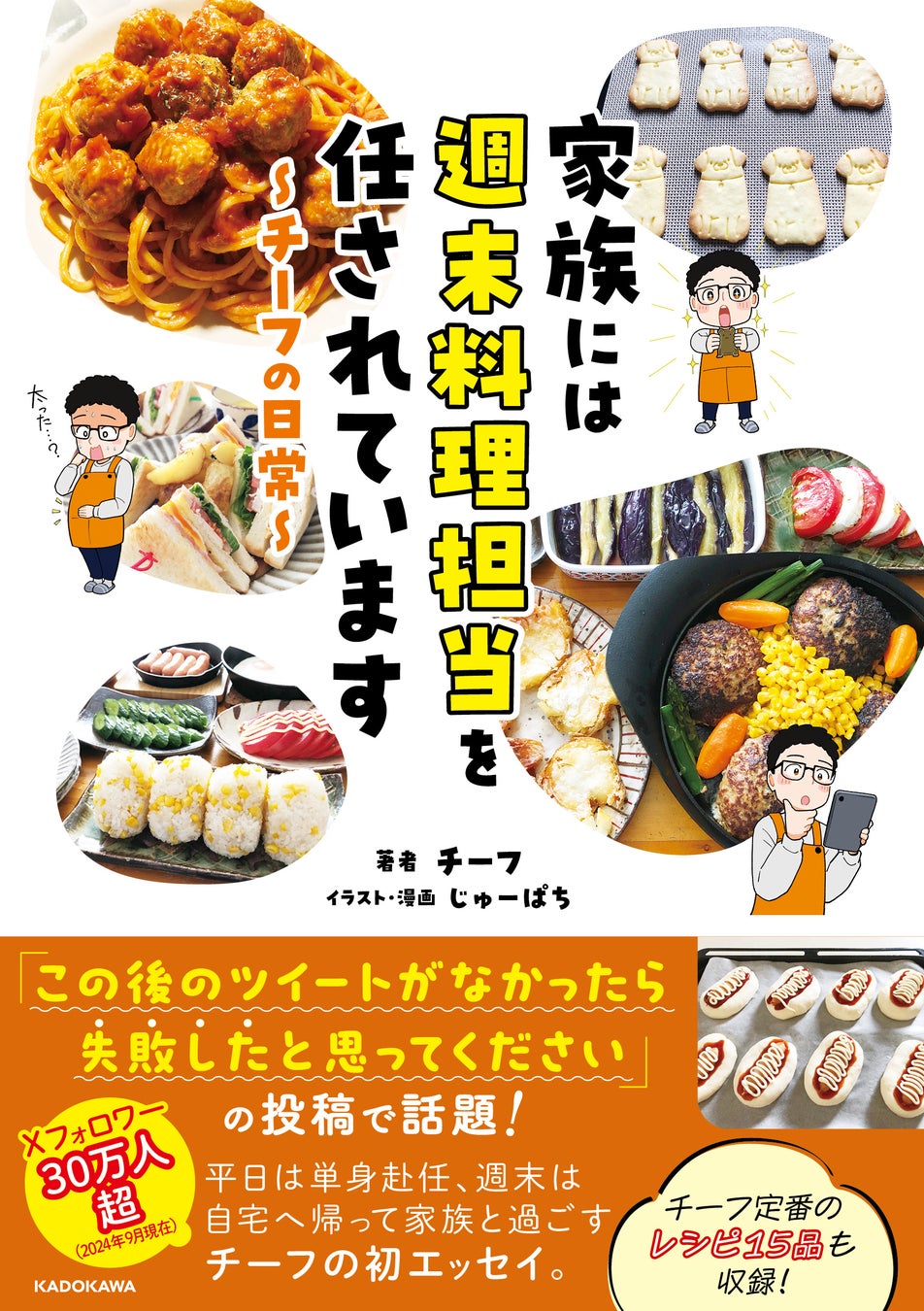 株式会社KADOKAWA(本社:東京都千代田区、取締役 代表執行役社長 CEO夏野剛)は、エッセイ『家族には週末料理担当を任されています ~チーフの日常~』(著者 チーフ、イラスト・漫画 じゅーぱち)を10月29日(火)に刊行いたします。全国の書店、Amazon、楽天ブックスなどで購入できます。