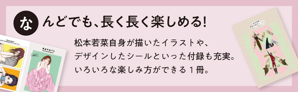 松本若菜を作り上げてきた形のあるもの、形のないものがまとめられ、まさに「松本若菜の素」をこの一冊に集約。本人の写真やイラストのシールなど遊び心も満載だ。
