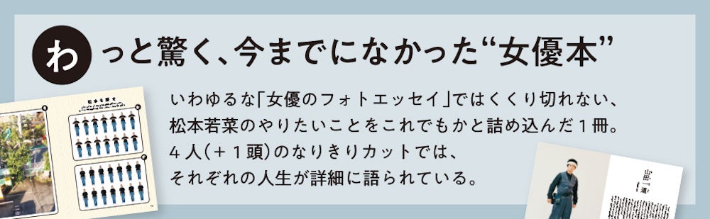 2023年2月の発売時には「『オシャレ』『かわいい』『かっこいい』などのテーマがあったほうがいいのかもしれませんがそれだと松本っぽくないので、いろいろとぶち込みました」とコメントしていた松本。その言葉通り、いわゆる女優のフォトエッセイの枠には到底収まらない、「人間・松本若菜」の魅力や面白さが凝縮された一冊となっている。