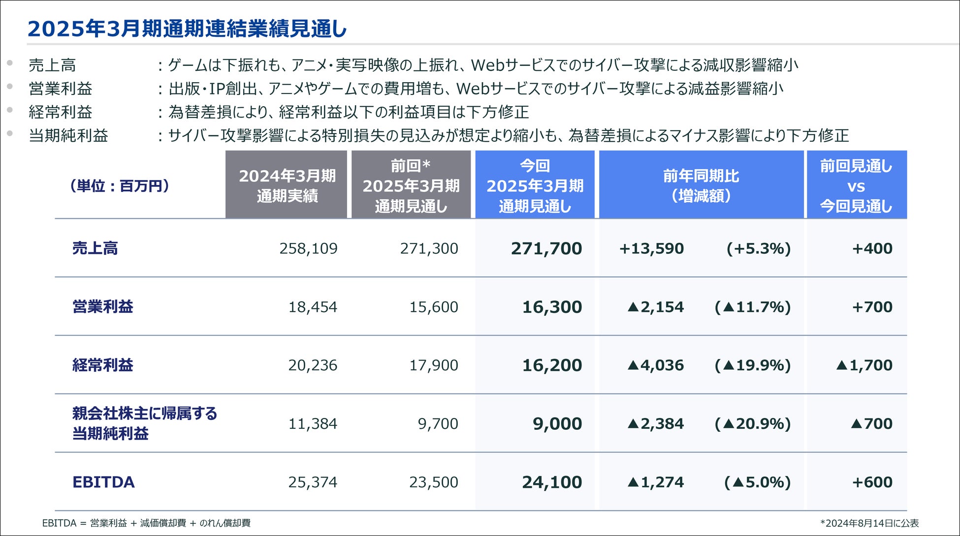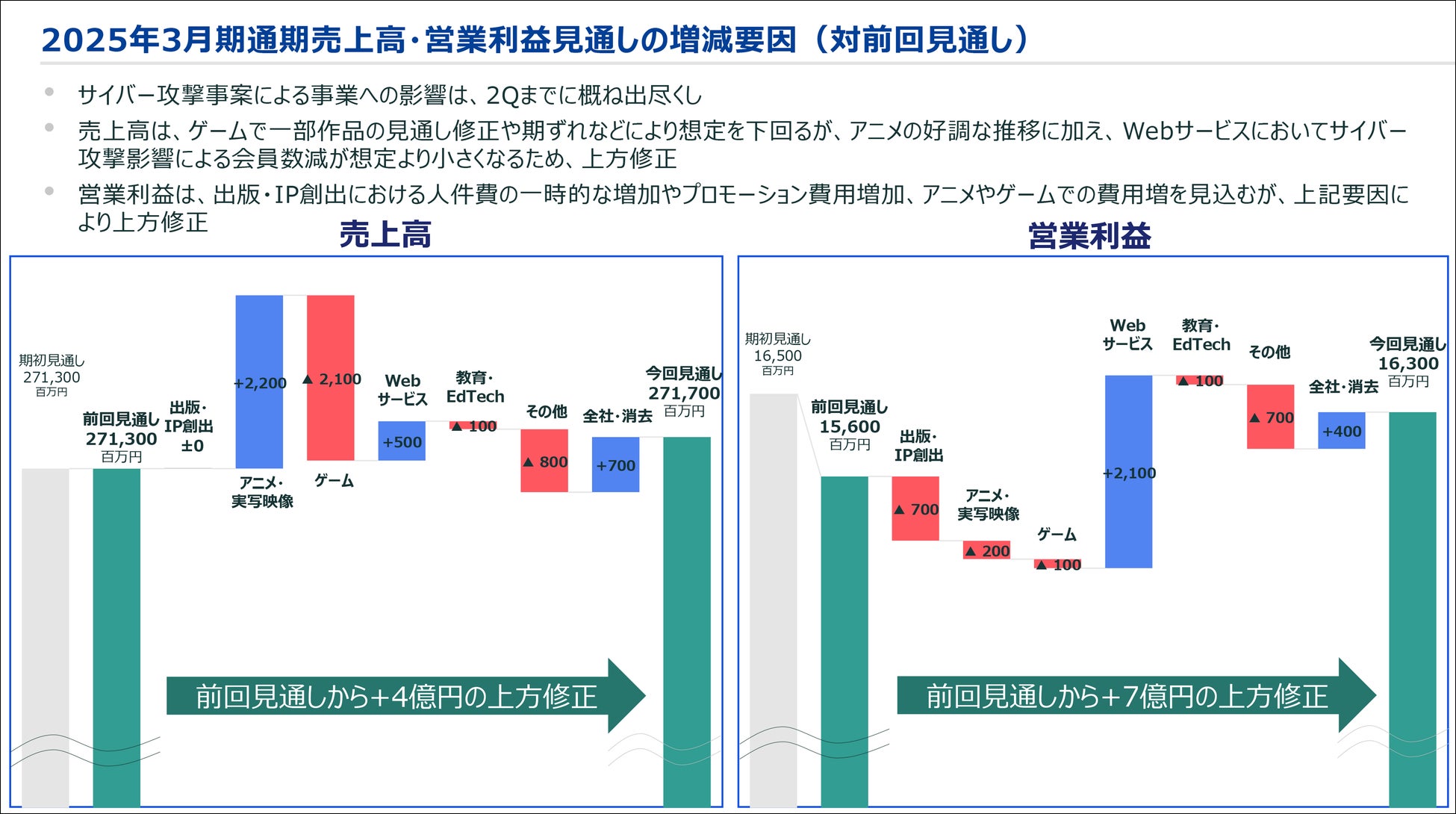売上高:ゲームで一部作品の見通し修正や期ずれなどにより想定を下回るが、アニメの好調な推移に加え、Webサービスにおいてサイバー攻撃影響による会員数減が想定より小さくなるため、上方修正