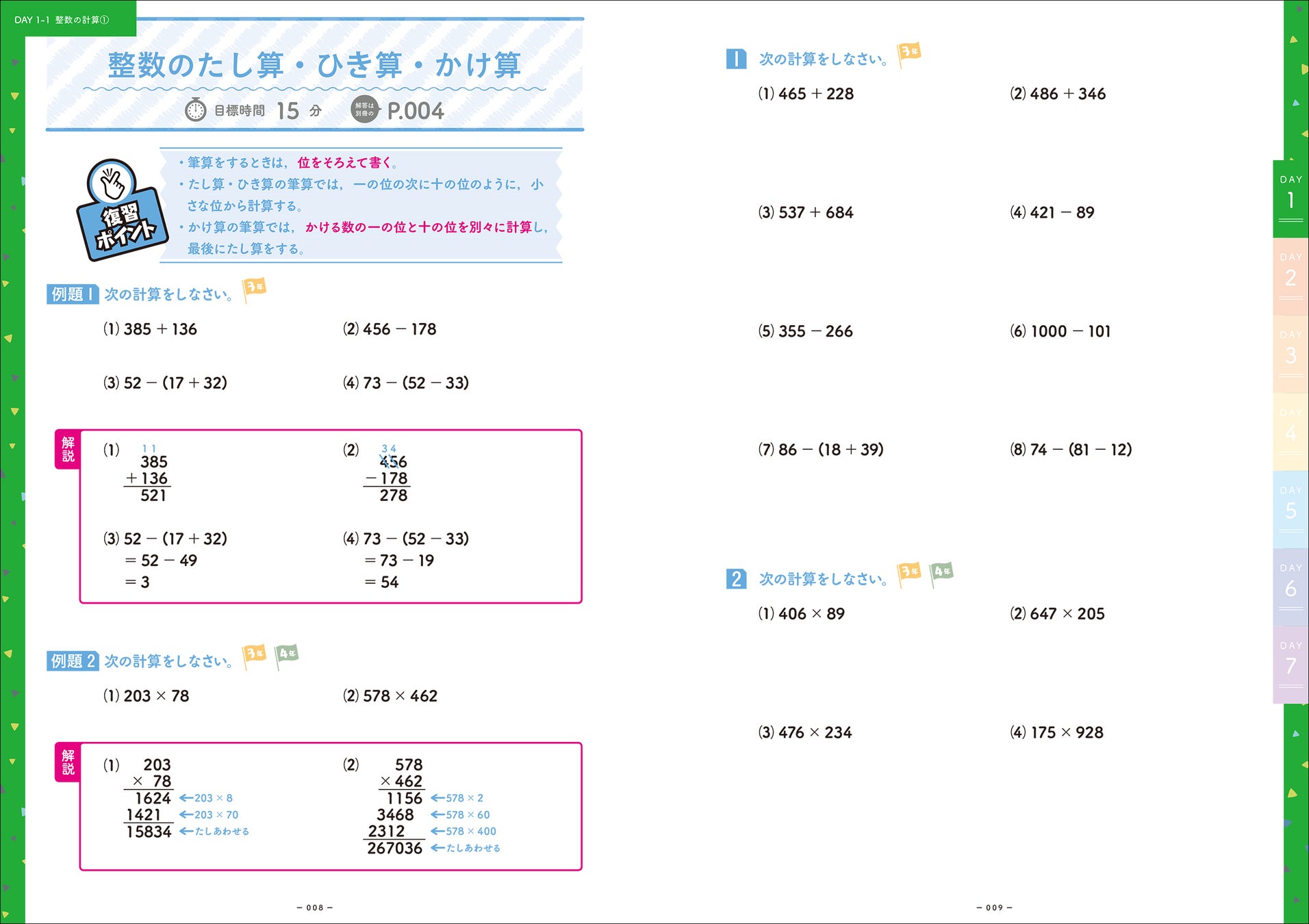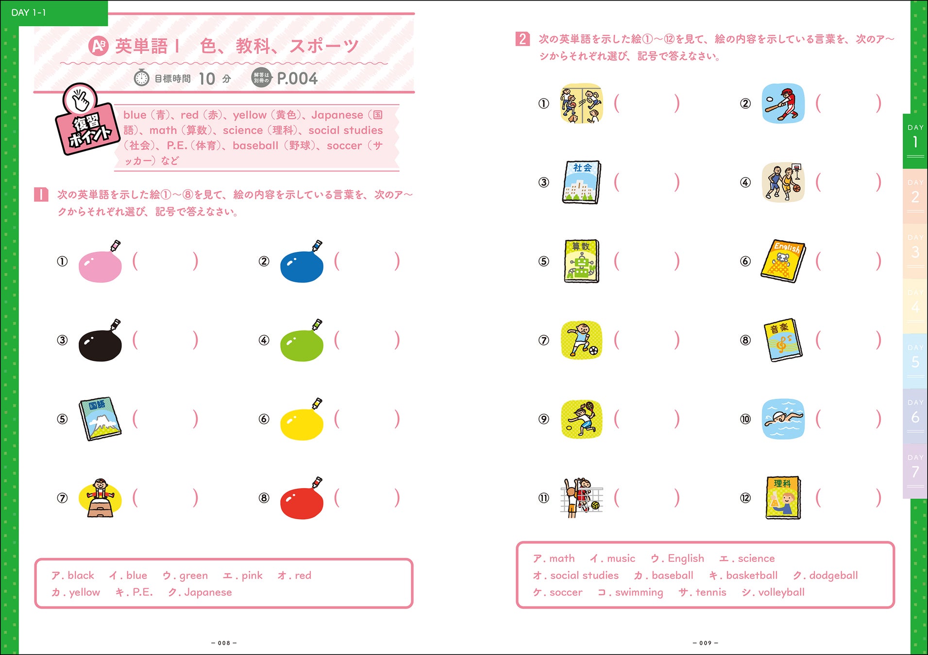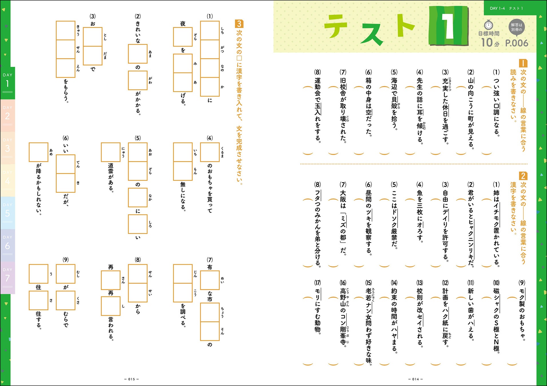「漢字」の総復習では、小学校1年生から6年生までに履修した漢字の「読み」「書き」「書き順」をていねいにおさらいできます。各問題に目標時間が定められており、各DAYのおわりにある「テスト」で学んだことをすぐに確認できます。巻末の「都道府県名一覧」では、都道府県と漢字を楽しみながら一緒に勉強できます。