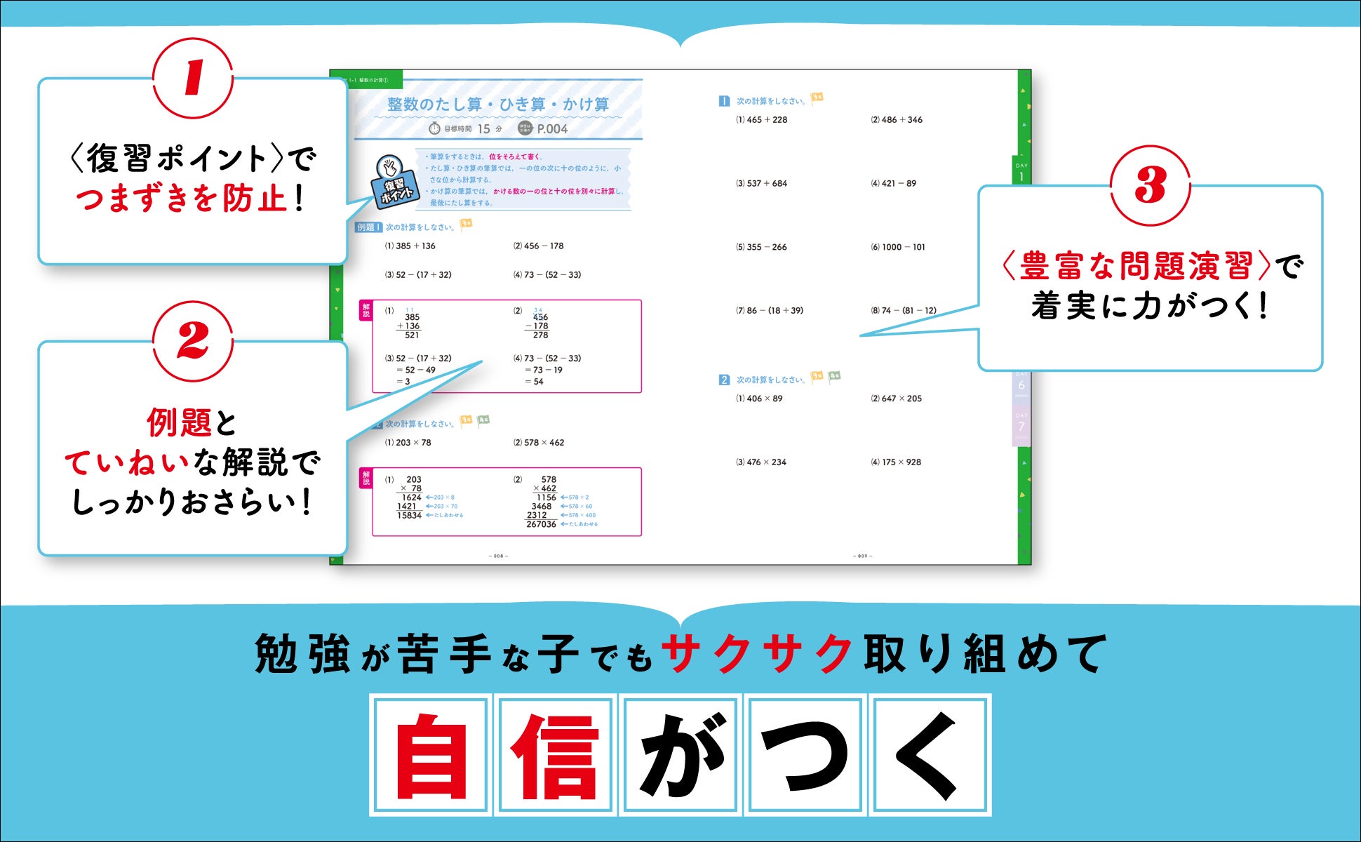はじめに復習ポイントが示されたうえで、シンプルな練習問題に取り組んでいく出題形式なので、勉強が苦手な子でもテンポよく集中して解き進められます。