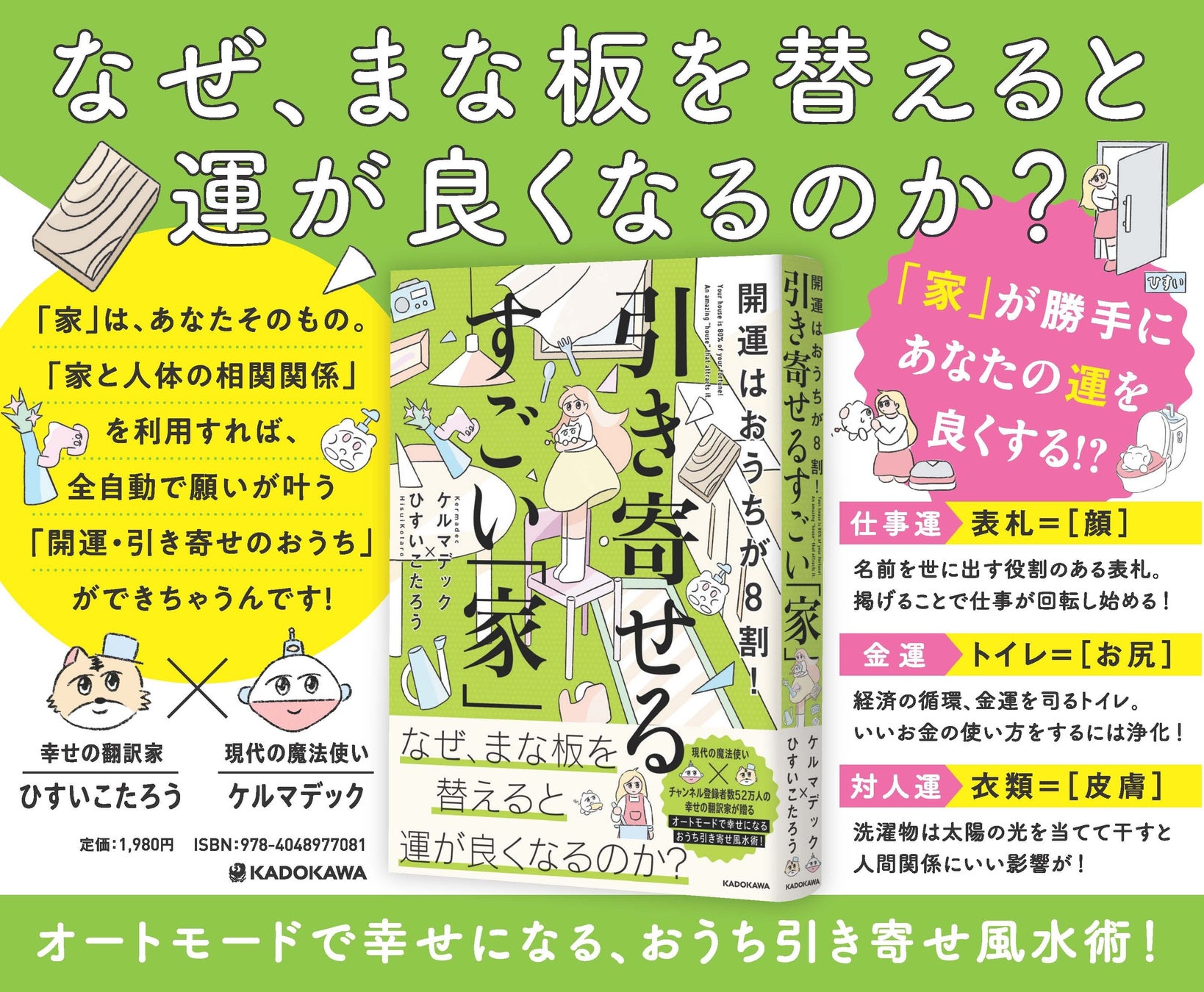 株式会社KADOKAWA(本社:東京都千代田区、取締役 代表執行役社長 CEO:夏野剛)は、2024年12月1日(日)~2025年1月4日(土)に、人気YouTuberで作家のひすいこたろう×ケルマデック共著『開運はおうちが8割! 引き寄せるすごい「家」』の京王線全線ドアステッカー広告を掲出いたします。