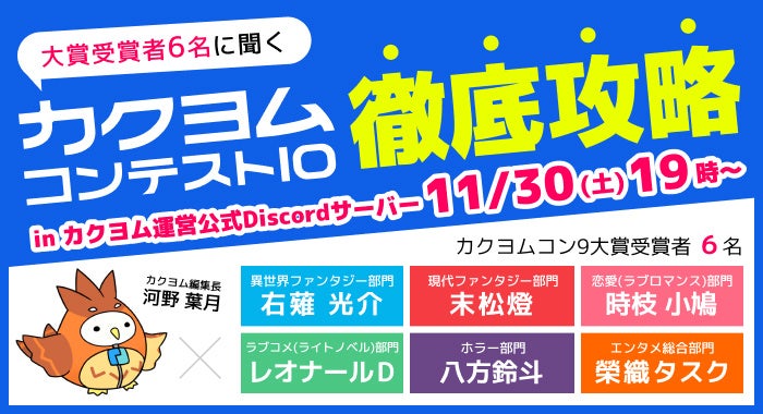 株式会社KADOKAWA(本社:東京都千代田区、取締役 代表執行役社長 CEO:夏野剛、以下KADOKAWA)は、Web小説サイト「カクヨム」が運営する公式Discordサーバーにて、「カクヨムコンテスト10」の募集開始を記念し、2024年11月30日(土)にトークイベント「大賞受賞者6名に聞く、カクヨムコン10徹底攻略」を開催します。