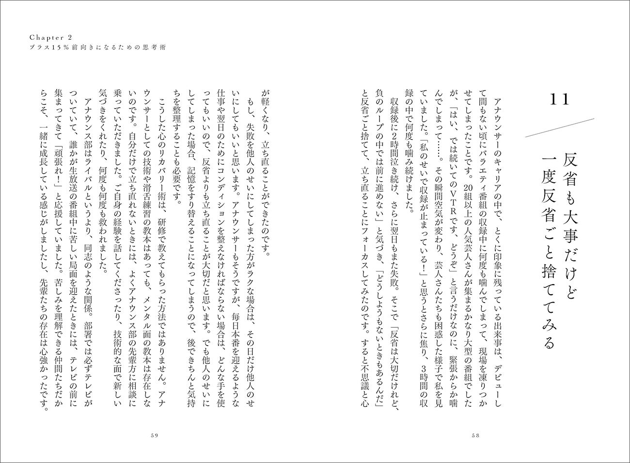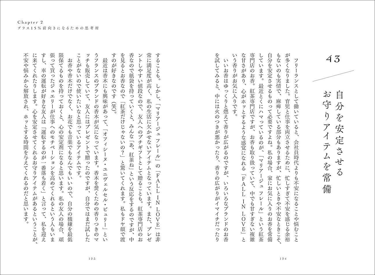 目の前の仕事と必死に向き合ってきた20代、チャレンジを始めた30代。人として大きく変わることは難しくても、毎日の心がけや行動を”たった15%だけ”ポジィティブ転換すると、気づかぬうちに自分のことを肯定したり好きになれたりと、いい変化が。自信がなく小心者だった私が、失敗や仲間との出会いを通して少しずつ変われた経験を等身大に語らせていただき、明日から使えるTipsを詰め込みました。