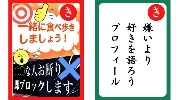 「自撮りのプロフィール写真を設定していたら誰からも『いいね』がこなかった…」「受け身の姿勢で会話も連絡も女性任せにしていたら音信不通に…」…etc。そんな失敗談を「かるた」にこめて笑い飛ばしてみんなでシェア。 みなさんのエピソードがユーモアに昇華したとき、これからの恋に対して前向きになれるはず!
