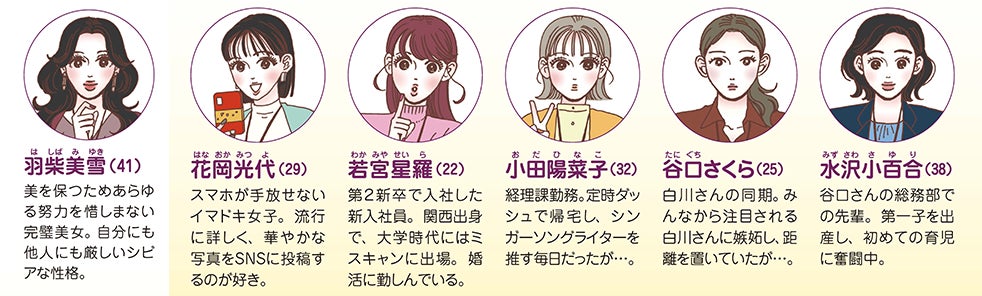 SNSが大好きなキラキラ女子、驚異のアラフォー美魔女、専業主婦になりたい婚活女子、推し活に勤しむ女性、初めての子育てに悩む主婦など……1巻から6巻まですべての単行本に新しいキャラが登場するのも、本シリーズが幅広い女性から支持されているポイントです。
