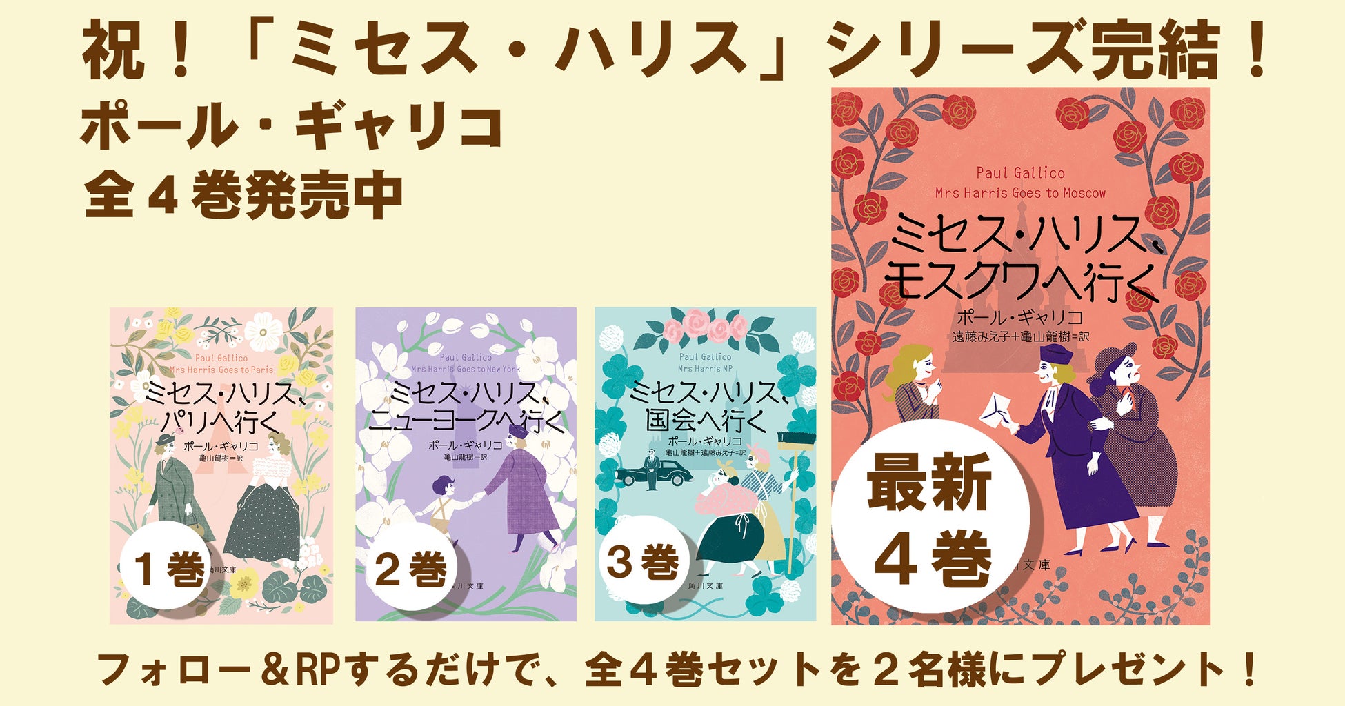 ポール・ギャリコの代表作「ミセス・ハリス」シリーズ第4巻『ミセス・ハリス、モスクワへ行く』(訳=遠藤みえ子、亀山龍樹)が、先日、角川文庫より発売されました。こちらで「ミセス・ハリス」シリーズは完結となります。それを記念して、2024年11月26日(火)12:00よりX(Twitter)で書籍のプレゼントキャンペーンを行います。