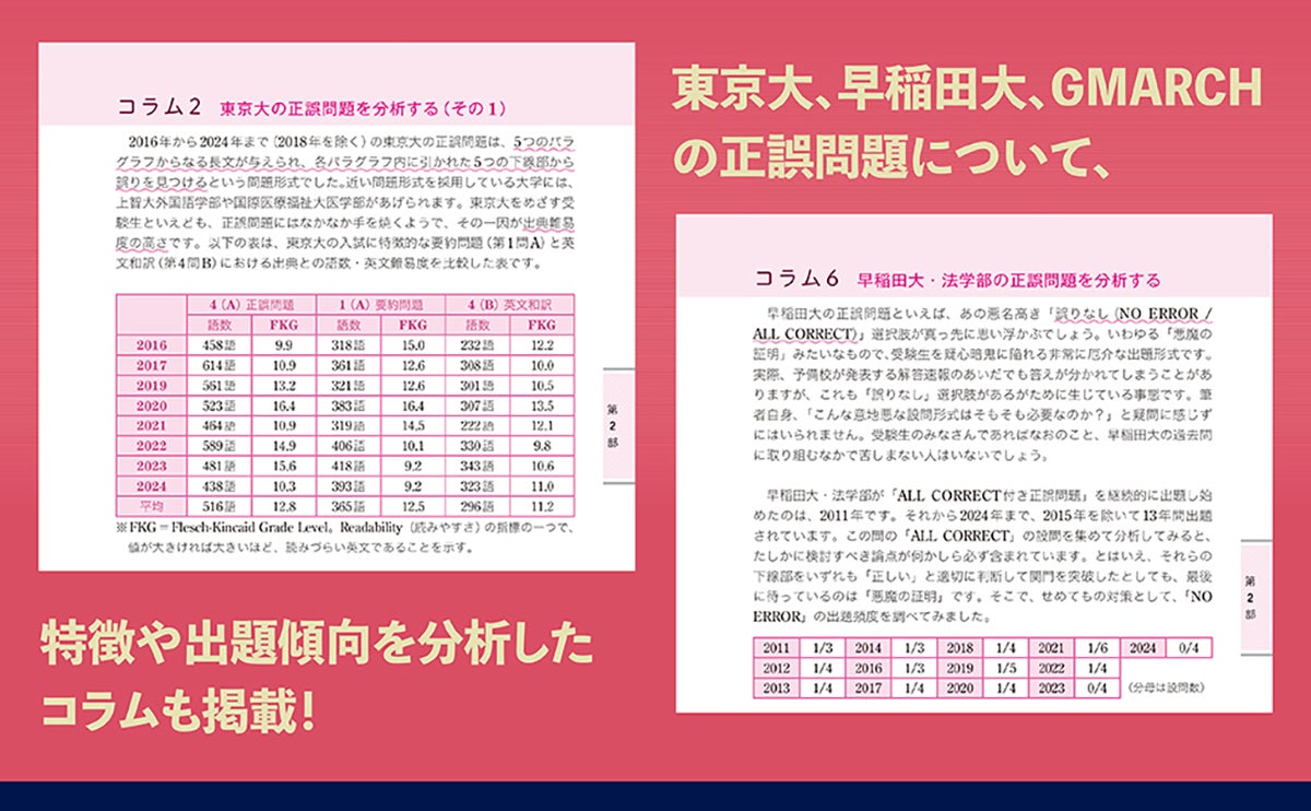 また、今回の改訂版では、東京大学、早稲田大学、GMARCHの入試で出題される正誤問題について、その特徴や難易度、今後の出題予想等を分析したコラムを新設しました。